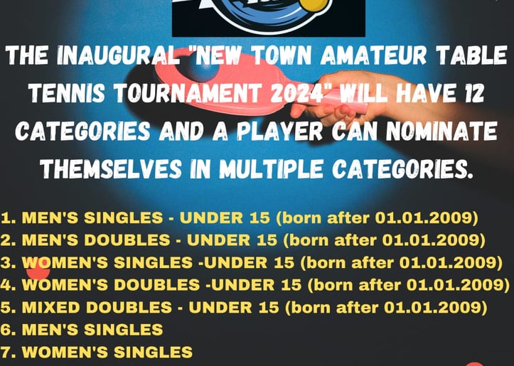 The New Town Amateur Sports Club (NTASC) is proud to host the inaugural New Town Amateur Table Tennis Tournament 2024. This exciting event, which will be held at the world-class Dhanuka Dhunseri Soumyadeep Poulomi Table Tennis Academy in New Town, offers a unique opportunity for local athletes to compete and showcase their skills. As the first-ever table tennis tournament in the New Town area, this event signifies our dedication to promote sports and foster a vibrant sporting community.